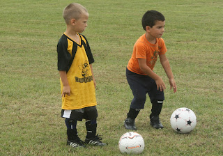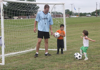 And it’s true. My children had a blast. Evan learned how to “bounce the ball like this” and “kick it across the grass like this”. Brianna, though a year too young to sign up, would not be left out of the festivities and also learned to kick the ball into the net. A coach had pity on her and gave her a pair of shin guards four inches too big – but she looked adorable.