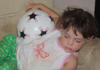 (Picture #3 – Soccer is a lot of fun – but hard work! She was so proud to have one “just like Bubba’s” she would not put it down. )