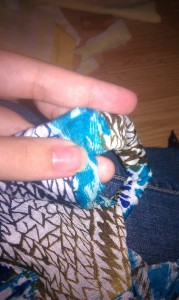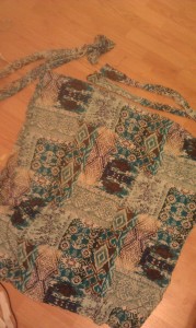 -2 Large Rectangles of fabric. Stretchier fabrics will need to be retied throughout the day, and stiff fabrics will not lay smoothly. Fine a happy medium for what you are wanting. Cotton jersey works nicely, as does that swishy fabric that hippie skirts are made of. Whatever it’s called, I like it. I make mine about 35” wide to last in pregnancy and not be too wide afterward. If they weren’t for maternity as well, I’d probably make them a bit narrower. Hold it around your waist, and you’ll want to see it wrap around to your mid thigh on either side. Both rectangles should be the same width. Length varies depending on whether you want pants, capris or shorts.