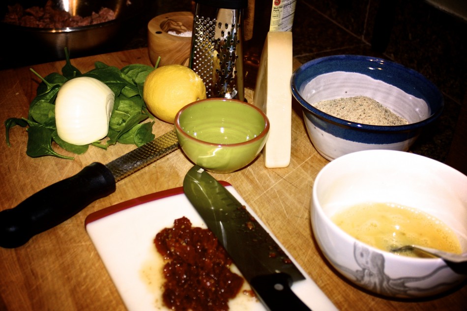 Grate 1/2 an onion over the meat mixture, you could certainly chop the onion, but I think this is better for the overall texture of the meatball.
