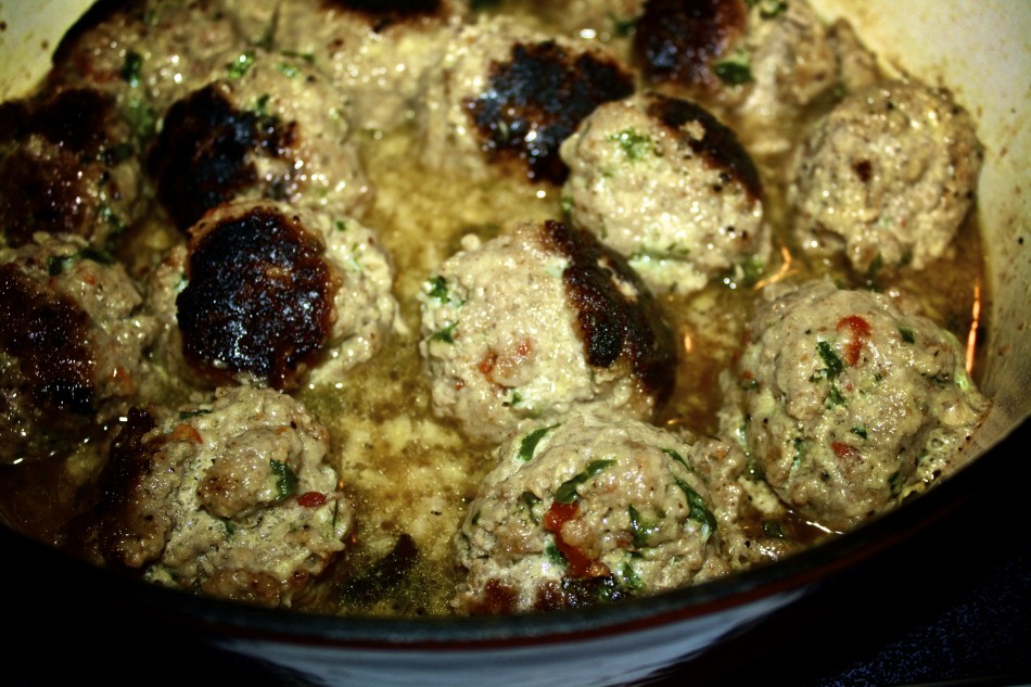 Pass each meatball through the breadcrumbs you set aside earlier and then place them in the heated pan. Brown them on all sides (this isn’t an exact science) for about 3-5 min.