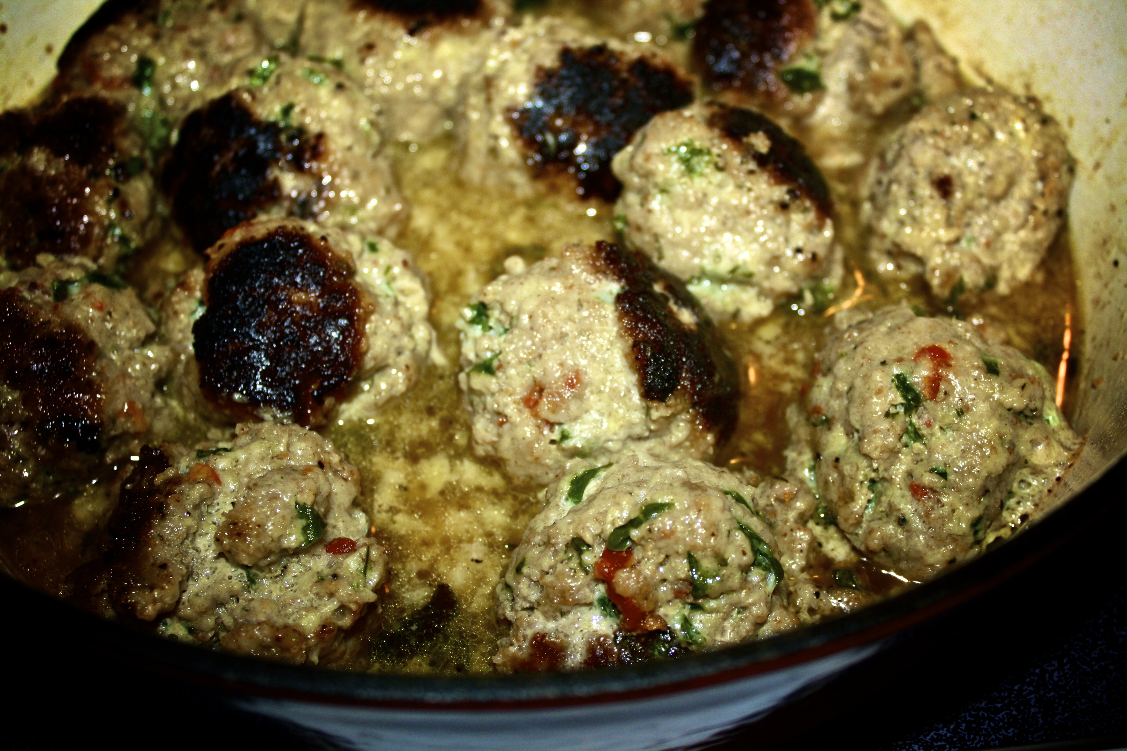 Add a splash of wine to the pan for flavor, let that cook down for a minute then add in about 1/4 c. of chicken stock, just make sure it’s enough to come about 1/2 way up the meatballs.